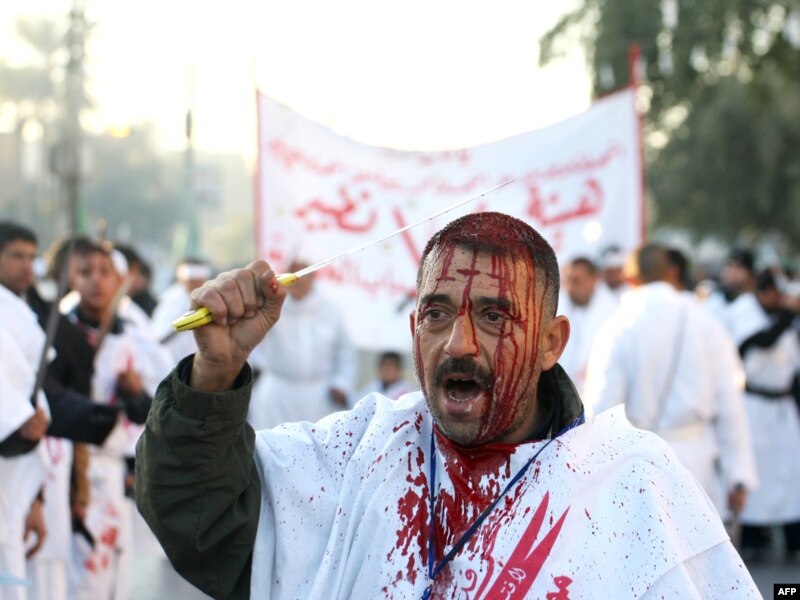 Кербалага келген жүз миңдеген зыяратчылар ыйык туткан имамын эскерип, өздөрүнүн денесин кан чыкканча камчылап, добулбастардын коштоосу менен ураан чакырышат.