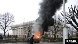 Ала-Тоо аянтындагы кабарчыбыздын айтымында, бул жакта жык-жыйма чогулган демонстранттар менен милициянын куралдуу күчтөрү кагылышты. Аларды көздөй Ак үйдүн төбөсүнөн ок атышууда. Бир нече адам ок тийип жыгылды. Ок тийген бир адамды “Тез жардам” алып кеткенин кабарчыбыз өзү көргөнүн билдирди. Төрт машина өрттөнүп атат. Аянтка келген эл улам көбөйүүдө.