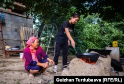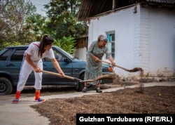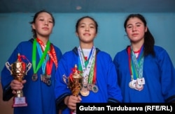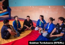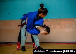 Балбан кыз Арууке Акибаев дөңгөлөк көтөрүп машыгып жатат. Базар-Коргон району. Каба айылы. СүрөтGulzhan Turdubaeva (RFE/RL)