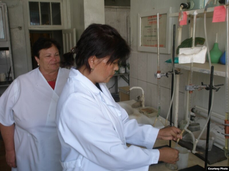 Айдеркен сымап комбинатынын Химиялык лабораториясы. Устат Иванова Тамара жана лаборант Паризат Сулайманова. 28-июль 2011
