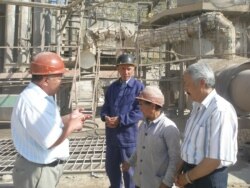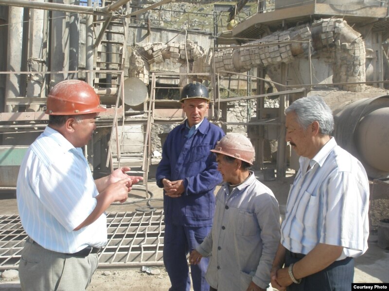 Айдеркен сымап комбинатынын металлургиялык заводунун мештеринин жанында башкы директор Т. Салиев(солдон оңго) заводдун директору С. Акбаров, ардагер устат К. Мавлянов жана заводдун техникалык көзөмөлдөө бөлүмүнүн башчысы Р. Туйгунов менен баарлашууда. 28-июль 2011
