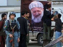 Ооган улуттук полициясынын кызматкери Бурхануддин Раббанинин сүрөтүн жабыштырып жаткан кишилерди күзөтүүдө. Кабыл, 21-сентябрь 2011