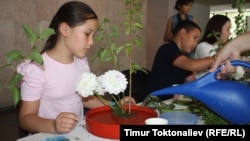 Мастер-класс жапондордун икэбана искусствосу боюнча өтүп жатат, аны болсо жапон эмес, Москвадан келген кыргызстандык Чынара Мундузбаева жүргүзүп жатат.