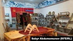 Музейди негиздегендердин бири, жетекчиси Абдинаби Кадыров чакан жайга топтолгон экспонат, буюм жана материалдардын ар биринин тарых-таржымалын түшүндүрүп берүүдө.