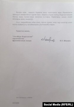 Жогорку Кеңештин төрагасы Нурланбек Шакиевдин атынан башкы прокурор Курманкул Зулушевге жазылган кат делген документтин сүрөтү