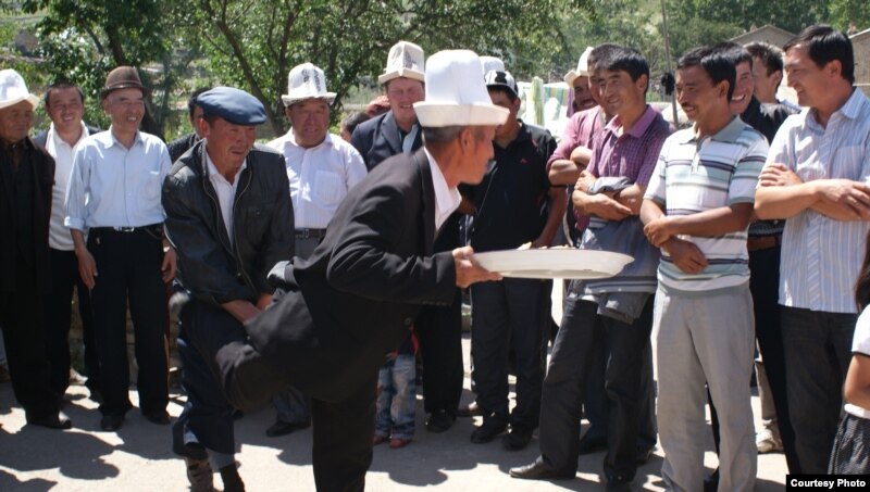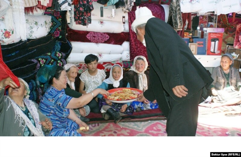 Кызды узатканда жүк көрүүнүн өзүнчө жол жобосу бар эмеспи. Бул тойдо жүк көрүү милдетин Муктар Өмүрбек аттуу айыл ырчысы аткарды. Ал колуна боорсок, чачыла салынган табакты көтөрүп ырдап жөнөдү: