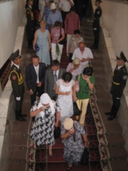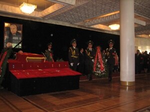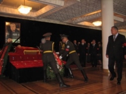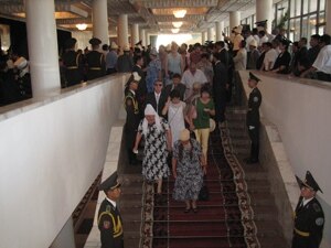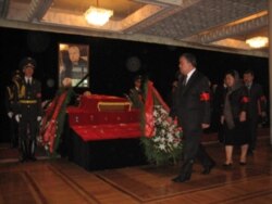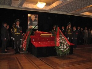 Бишкектеги улуттук филармонияда атактуу жазуучу Чыңгыз Айтматов --> /rubrics/culture/ky/2008/06/67999CF2-1F72-4096-8C7F-08077AAB9359.ASP менен коштошуу зыйнаты уюштурулуп, ага жазуучунун миңдеген окурмандары, замандаштары, мекендештери жана чет өлкөлүк өкүлдөр катышты. Эртең мененки саат 07:00дө чогула баштаган эл, саат 09:00гө карай филармониянын чыгыш ыптасында тирелип, 35 градус кайнаган ысыкка карабай жазуучуну акыркы сапарга узатып, бир көрүп өтүү үчүн кезекке турушту. Филармониянын чыгыш ыптасындагы эшигинен кирип, батыш ыптасынан чыгып жаткан элдин аягы такыр суубай, миңдеген адамдар имараттын ичине кирип чыгууга үлгүрүшкөн жок. Саат 12:00дөн кийин филармониянын маңдайында азалуу митинг уюштурулуп, Ч.Айтматовдун сөөгүн сыртка алып чыгышты. Имараттын ичине кирип чыгууга үлгүрбөй калган элдер филармониянын алдына чогулушту. Азалуу митингдин башында президент Курманбек Бакиев баштаган бир катар адамдар, коомдук ишмерлер, чет элдик коноктор, акын-жазуучулар сөз сүйлөшүп, залкар жазуучунун дүйнөдөн өткөнүнө байланыштуу анын үйбүлөсүнө, жакындарына, жалпы элине көңүл айтышты. Митинг аяктагандан кийин жазуучунун сөөгүн Кыргызстандын куралдуу күчтөрүнүн аскерлери көтөрүп, Алатоо аянтын көздөй жөнөштү. Алатоо аянтында чогулган эл жазуучуну бир мүнөттөй эскерүүгө турушуп, андан ары Ч.Айтматовдун сөөгүн Ата Бейит мемориалдык комплексине алып барышты.